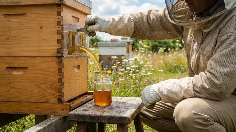従来のフレーム:収穫は工業的なプロセスです。巣箱を開け、重い蜂のフレームを取り出し、それらを払い落とし、フレームを輸送し、熱いナイフでワックスの蓋を切り取り、遠心抽出機で回転させます。効果的ですが、労働集約的で、コロニーを混乱させ、かなりの清掃が必要です。